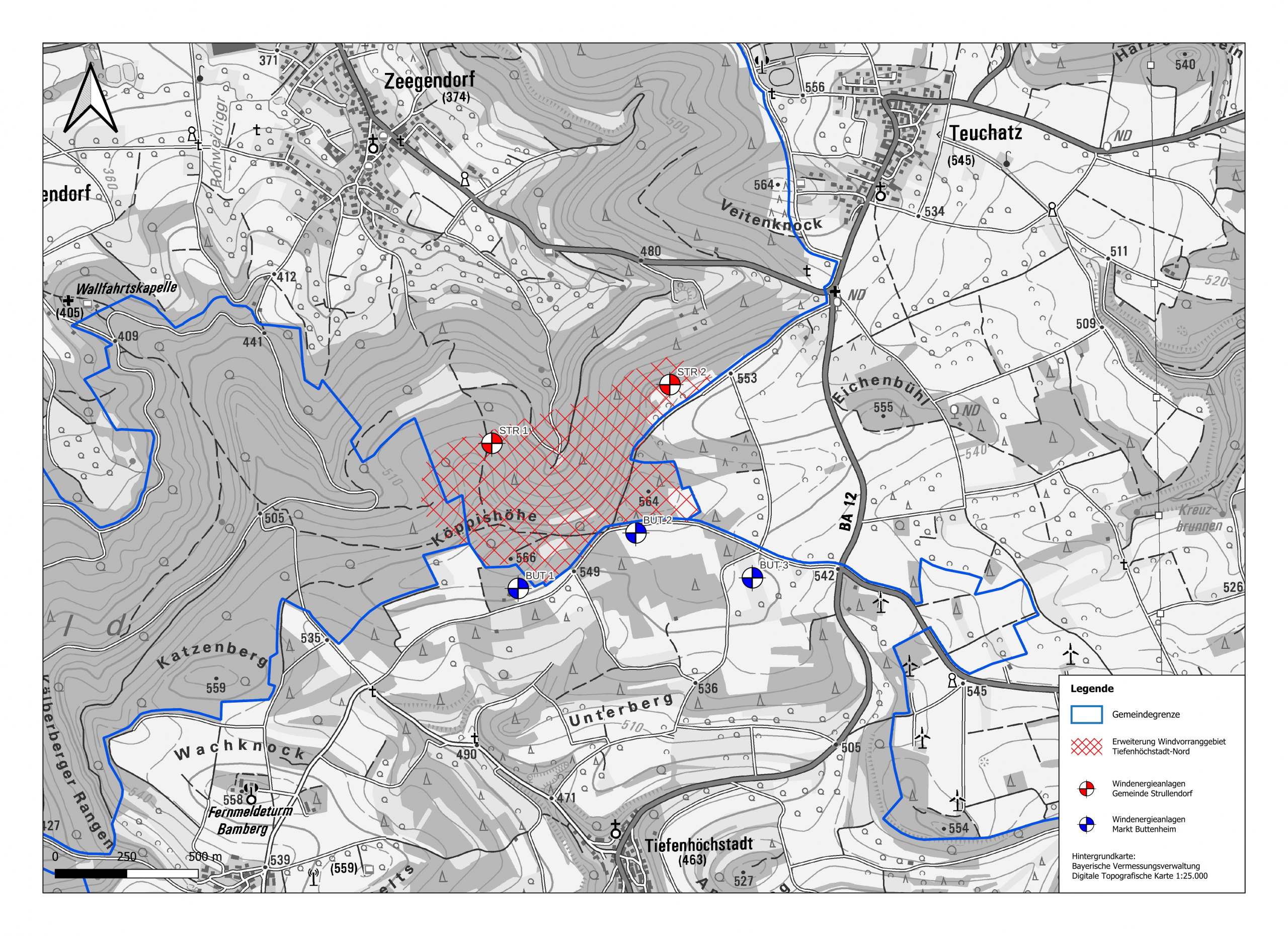 Das Windvorranggebiet befindet sich südlich der Ortschaften Zeegendorf (Gemeinde Strullendorf) und Teuchatz (Markt Heiligenstadt) und nördlich von Tiefenhöchstadt (Markt Buttenheim). Die im Gebiet vorherrschenden Windgeschwindigkeiten in 160 m Höhe betragen um die 6,8 m/s und stellen eine wirtschaftlich gute Grundlage dar. Eine der beiden Anlagen ist auf einer Freifläche geplant, die andere Anlage im Wald. Die Abstände zur nächsten Wohnbebauung betragen von jeder Anlage mindestens 800 m.